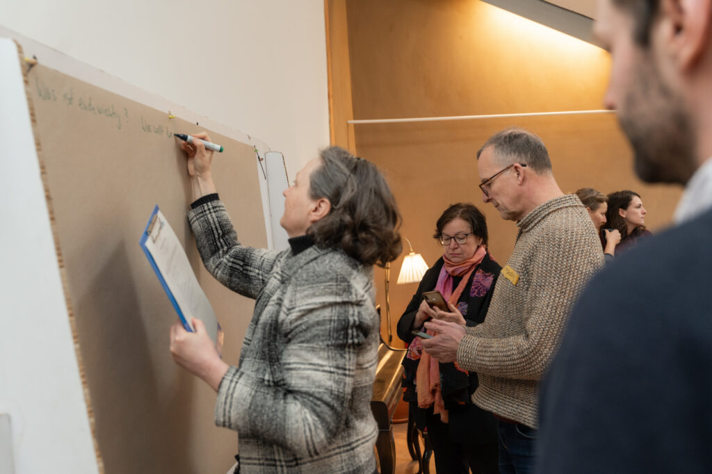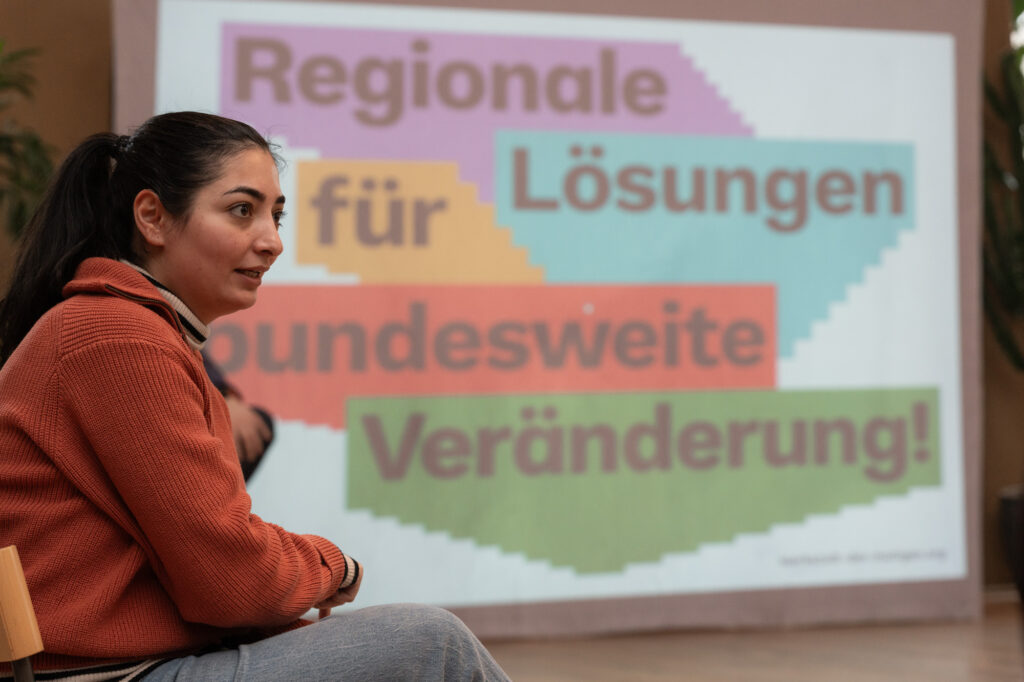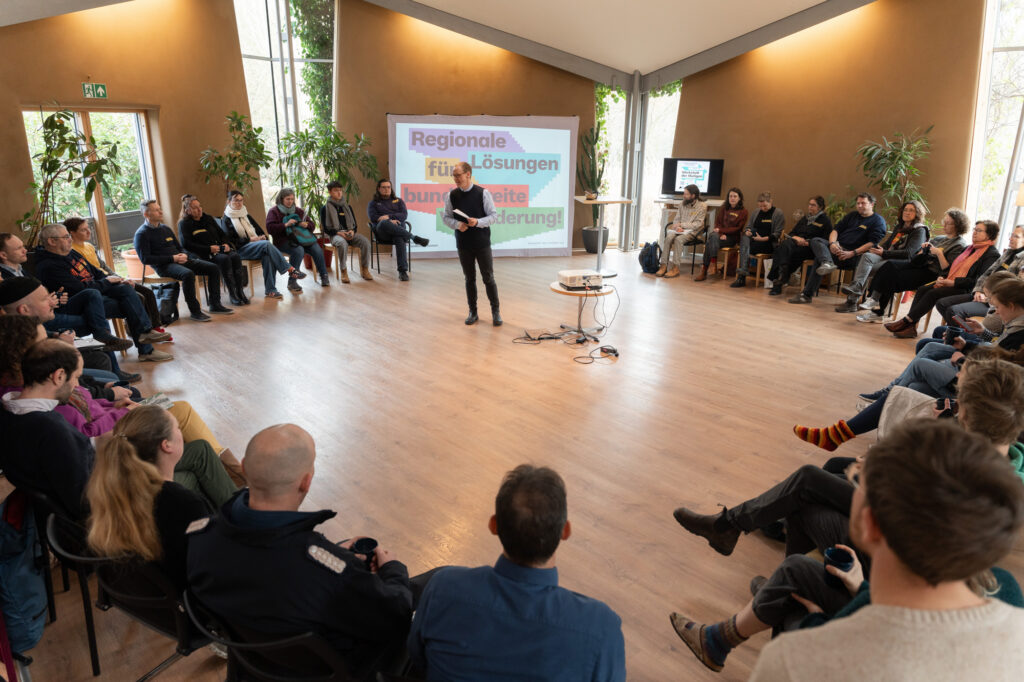 Im Anschluss an die Workshoparbeit stand die Vorstellung dieser Ergebnisse für alle Teilnehmenden auf dem Programm. Seitens der Politik waren zu dieser Runde u. a. Reem Alabali-Radovan (SPD), Miro Zahra (Bündnis 90 / Die Grünen), Horst Krumpen (LINKE) und Christian Krüger-El Bissani (Volt) dazugestoßen. Auch in den anderen Themengruppen wurden eine Verschlankung der Bürokratie, mehr transparente Kommunikation mit den Bürgerinnen und Bürgern, gemeinwohlorientiertes Wirtschaften und eine entsprechende Konzentration der Förderung auf solche Maßnahmen, sowie mehr Beteiligungsmöglichkeiten, Integration und Stärkung des Ehrenamtes und partizipativer Projekte zur Förderung des gesellschaftlichen Zusammenhalts als wichtige konkrete Punkte für die Region genannt. Zu einzelnen Punkte bezogen die politischen Akteure in einer Fishbowl-Runde anschließend Position und diskutierten mit Teilnehmenden mögliche Lösungsansätze und Umsetzungsstrategien.